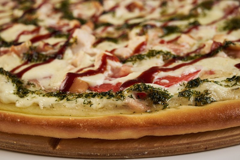 Состав: Ветчина, грудка куриная п/к, сыр моцарела, помидоры, соус песто, соус барбекю, соус сметанный, зелень, базелик.